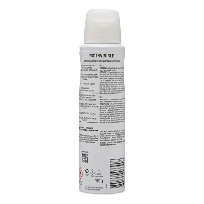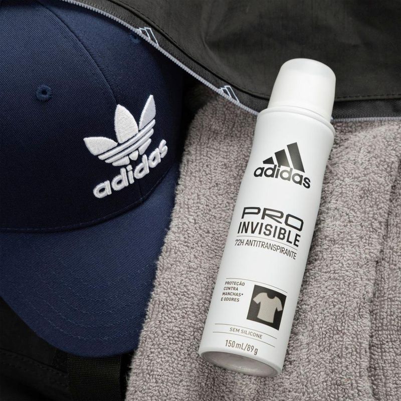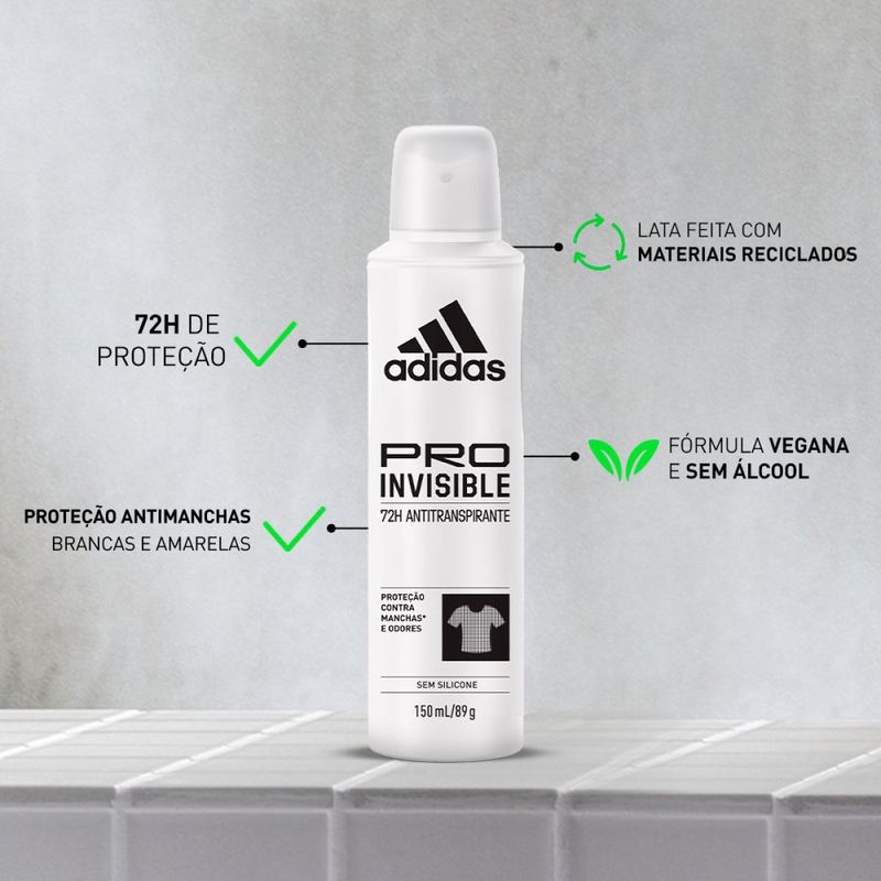 Para oferecer uma performance sem manchas, o desodorante aerossol Adidas Pro Invisible tem fórmula exclusiva desenvolvida com atletas, ação antibacteriana e sistema antimanchas brancas e amarelas, mantendo você seca e protegida por até 48 horas. Dermatologicamente testado, o desodorante aerossol Adidas Pro Invisible possui 0% de álcool, respeitando pH da pele.