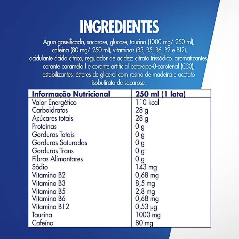 Ingredientes: Água gaseificada, sacarose, glucose, taurina(1000mg/250ml), cafeína (80mg/250ml), vitaminas ( B3, B5, B6, B2, B12), acidulante ácido cítrico, regulador de acidez citrato de sódio, aromatizantes,, corante caramelo I e corante artificial beta-apo-8 carotenol, estabilizantes: ésteres de glicerol com resina de madeira e acetato de isobutirato de sacarose.