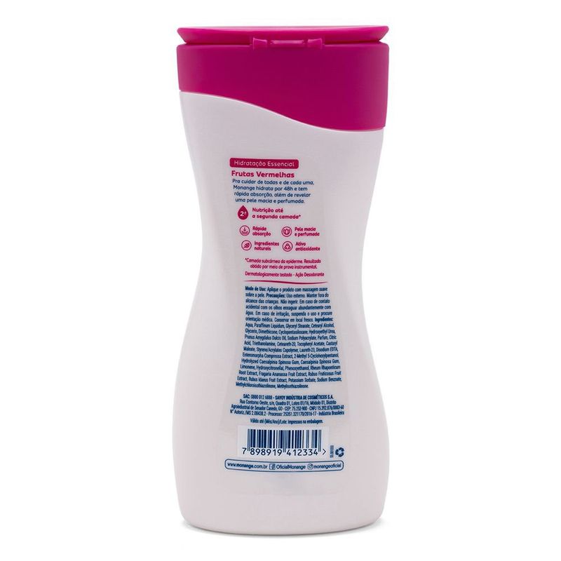Indicado para todos os tipos de pele, o Hidratante Monange Hidratação Nutritiva Frutas Vermelhas hidrata por 48h e ajuda a combater o envelhecimento precoce. Além disso, sua fórmula com frutas vermelhas possui ação desodorante e nutre até a segunda camada (camada subcórnea da epiderme).