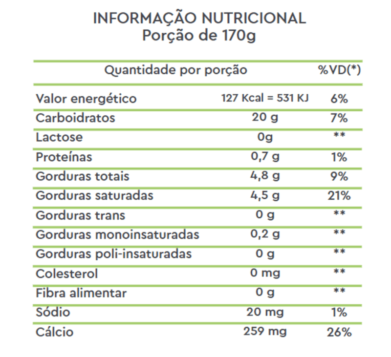 Feito com leite de coco, é muito cremoso e gostoso, perfeito para seu café da manhã ou para consumir entre as refeições. É 100% vegetal, fonte de cálcio, sem lactose, zero glúten e colesterol.