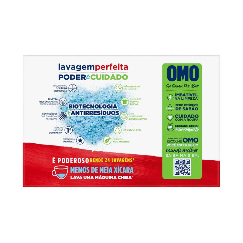 O Sabão em Pó OMO Lavagem Perfeita contém uma nova fórmula com Biotecnologia + Anti-Resíduos, garantindo máxima limpeza e zero danos de resíduos de sabão. Sua fórmula com pó ultrafino de rápida dissolução, remove as manchas de primeira, sem desgastar os tecidos e ainda cuida das cores pretas. Ele oferece muito poder e cuidado para as suas roupas e ainda a deixa perfumada por muito mais tempo. O lava roupas Lavagem Perfeita OMO cuida das suas roupas, da sua máquina e do meio ambiente. É imbatível na limpeza* e cuida do meio ambiente, pois sua fórmula contém ingredientes biodegradáveis, e não possui fosfato, ajudando a preservar rios e oceanos, além de economizar água**. Além disso, possui ativo concentrado, tecnologia que cuida do planeta. Menos CO2, menos poluição. É um lava-roupas sustentável e com rendimento eficiente, pois necessita de apenas um enxágue e permite lavar uma máquina cheia com apenas meia xícara***. Perfeito para manter suas roupas impecáveis e seu dia a dia super prático! Sua embalagem é 100% reciclável. Faça o descarte consciente. Nós sOMOs diferentes, limpeza imbatível, sem resíduo de sabão, cuidamos das roupas e cuidamos do meio ambiente. Quando você escolhe OMO, você escolhe um mundo melhor. Mantenha o produto fora do alcance de crianças e dos animais domésticos. Leia o rótulo antes de usar o produto. Para saber mais sobre a linha de produtos OMO, acesse o site. *Comparado a detergentes do mesmo fabricante. Remove manchas como suco de laranja, sobremesa de chocolate e óleo de fritura (tecido de algodão). **Reduzindo de 2 ou mais enxágues para apenas 1.***Xícara de chá de 240 ml. Máquina de abertura superior.