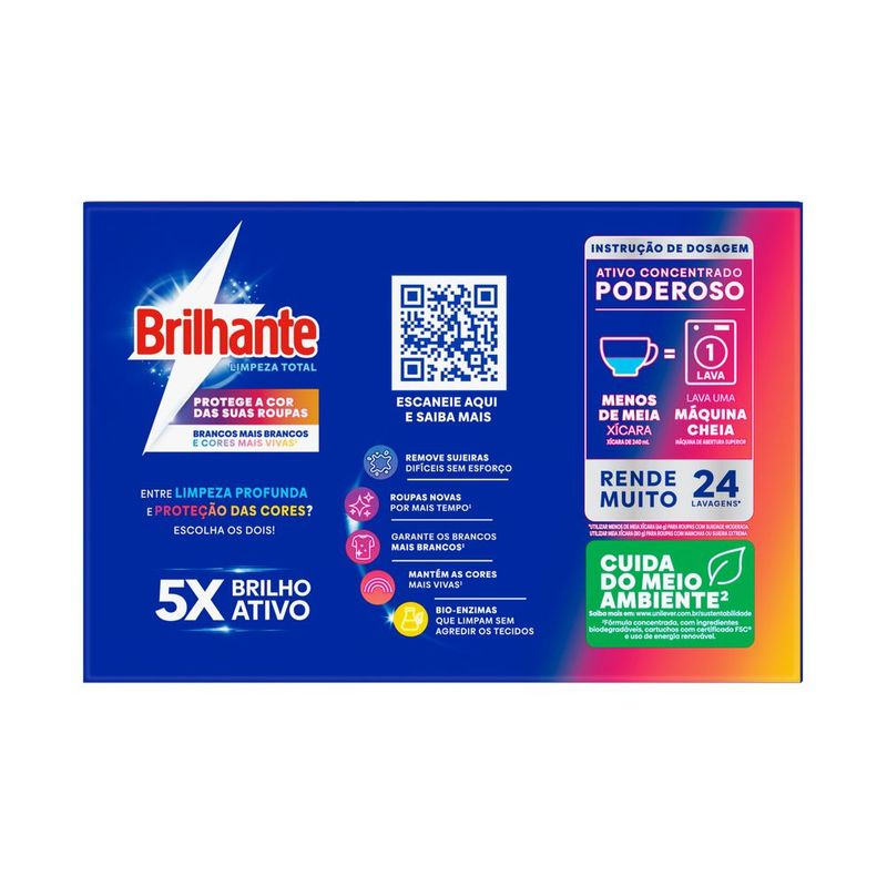 O Sabão em Pó Brilhante Cuidado Total para lavar roupas combina os melhores resultados de limpeza e perfume com toque de maciez dos tecidos: de um lado, o poder das enzimas, que proporciona uma limpeza profunda ao mesmo tempo que evita que a sujeira volte a se depositar nas roupas; do outro, a tecnologia Amaciante Encapsulado que dá um toque de maciez e perfume para suas roupas. O Lava Roupas em Pó Brilhante Cuidado Total limpa profundamente sem agredir os tecidos enquanto ajuda a prevenir os sinais de desgaste das suas peças preferidas, deixando-as macias ao toque após cada lavagem de roupa. Mantenha as suas roupas suaves por mais tempo. Entre limpeza profunda e cuidado com as roupas? Escolha os dois! Com Brilhante em sua lavanderia, você sempre leva mais com a solução completa! Brilhante limpa as suas roupas brancas e coloridas enquanto entrega uma liberação de perfume e maciez. É um ativo concentrado poderoso: basta meia xícara de chá do produto para lavar uma máquina cheia. Brilhante quer tornar-se um aliado nas tarefas diárias de seus consumidores e busca trazer praticidade com produtos inovadores, que todo mundo possa usar, diminuindo o peso das tarefas e liberando tempo para as demais atividades do dia a dia.