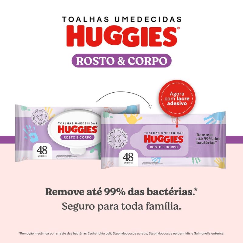 As toalhas umedecidas Huggies possuem pH balanceado e ajudam a manter a pele do seu bebê saudável.;