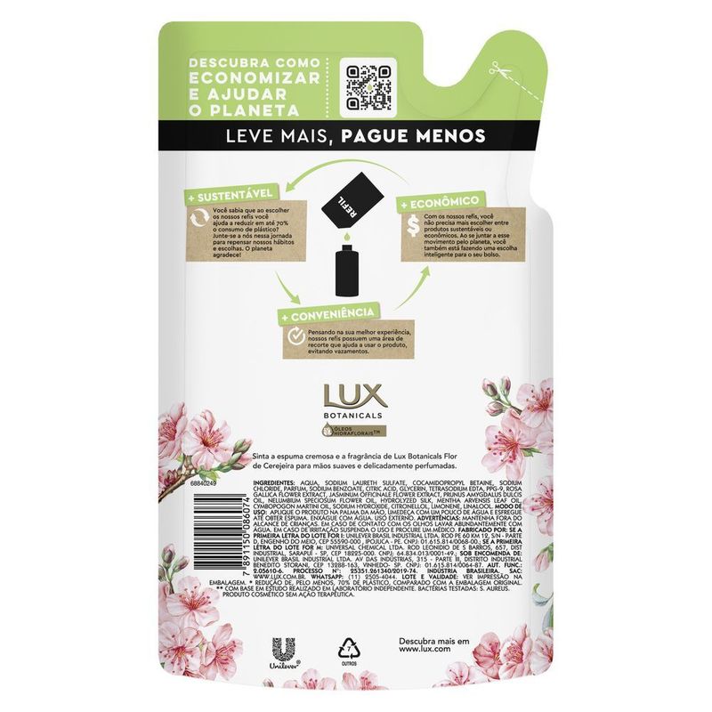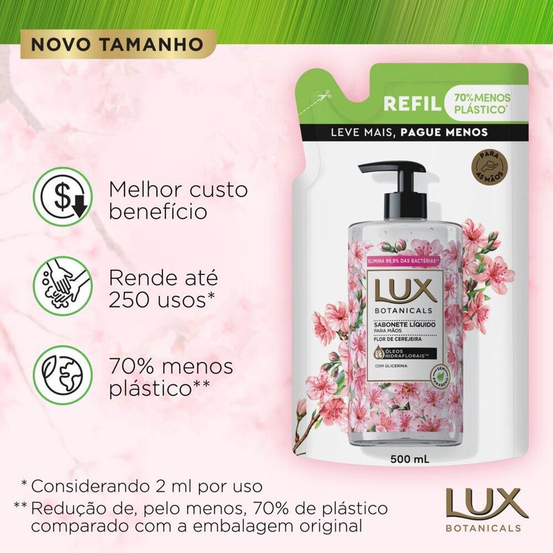 • Sabonete Líquido Refil Lux Botanicals Flor de Cerejeira possui uma fragrância única, especial e relaxante • Este sabonete líquido elimina 99,9% das bactérias** • Experimente o Sabonete Líquido Lux Botanicals Flor de Cerejeira e desfrute de mãos suaves e delicadamente perfumadas • Sua fórmula contém glicerina e óleos hidraflorais, ingredientes conhecidos pelas propriedades altamente hidratantes • A opção refil possui 70% menos plástico* contribuindo para um planeta mais sustentável • Com o nosso sabonete refil, você escolhe sustentabilidade e economia. Ao se juntar a esse movimento pelo planeta, está fazendo uma escolha inteligente para o seu bolso Sinta a espuma cremosa e a delicada fragrância do Sabonete Líquido Refil Lux Botanicals Flor de Cerejeira para mãos suaves e delicadamente perfumadas. Sua fórmula foi especialmente desenvolvida para proporcionar uma proteção que elimina 99,9% das bactérias**. A fragrância de Flor de Cerejeira contém Óleos Hidraflorais, uma combinação de extratos de flores e óleos essenciais extraídos da natureza, que ajuda no cuidado da pele contra o ressecamento, deixando-a delicadamente macia ao toque. Além disso, o Sabonete Líquido Refil Lux Botanicals Flor de Cerejeira contém glicerina, ingrediente conhecido pelas propriedades altamente hidratantes. Experimente as outras fragrâncias dos refis corporais e para as mãos de Lux Botanicals: Rosas Francesas, Erva Doce, Buquê de Jasmim e Capim-Limão. Os novos refis possuem 70% menos plástico* contribuindo para um planeta mais sustentável, e ainda garantem benefícios como: mais conveniência, facilidade ao refilar sem desperdício e o melhor custo-benefício. Com os nossos refis, você não precisa mais escolher entre produtos sustentáveis ou econômicos. Ao se juntar a esse movimento pelo planeta, você também está fazendo uma escolha inteligente para o seu bolso. *Redução de, pelo menos, 70% de plástico, comparado com a embalagem original. **Com base em estudo realizado em laboratório independente. Bactérias testadas: S.Aureus. Produto cosmético sem ação terapêutica.